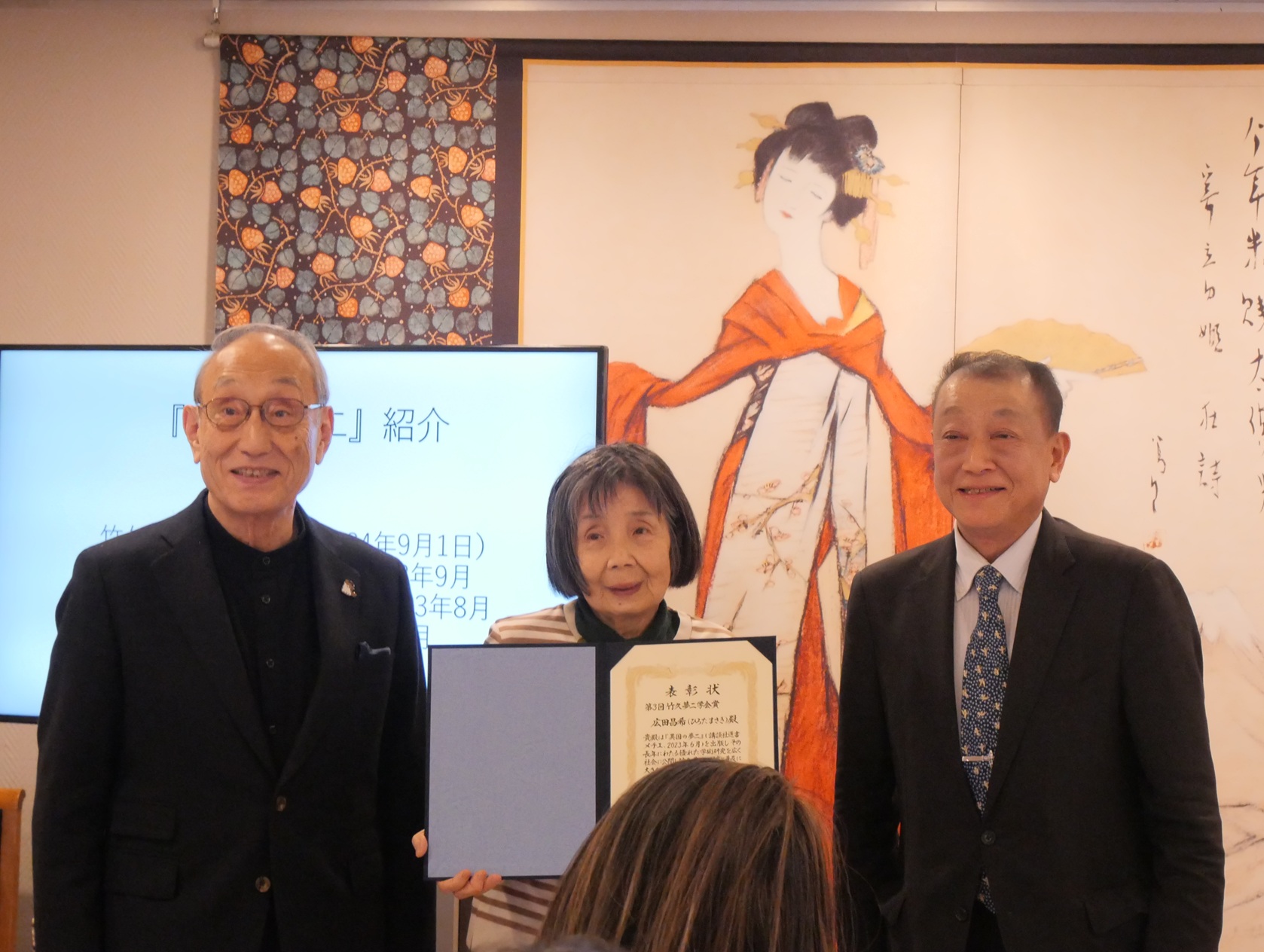 今次総会において、当会正会員で大阪大学名誉教授の故・廣田昌希氏の著書『異国の夢二』が「第3回竹久夢二学会賞」に選出され、授賞式では奥様が賞を受け取られました。